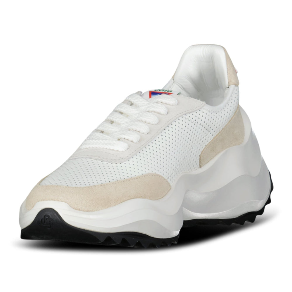 Crafted with a perforated white upper for breathability, this silhouette is accented with soft suede overlays in neutral tones, adding depth and texture to the design. The side features subtle Casa Sport branding, while the exaggerated sculpted midsole and rugged black outsole create a dynamic, fashion-forward profile with enhanced grip and stability.