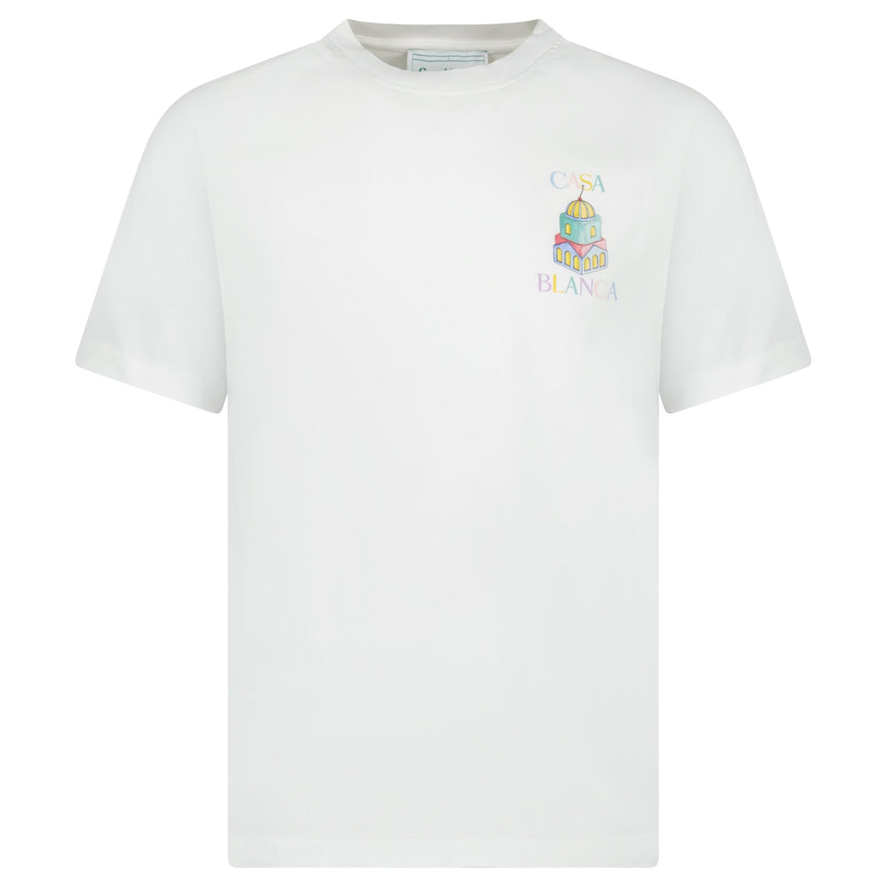 Crafted from premium organic cotton jersey, this short-sleeve tee features a small Casa Blanca graphic at the chest, incorporating soft pastel tones and architectural-inspired artwork for a distinctive yet understated finish. The crisp white base keeps styling effortless and versatile.
