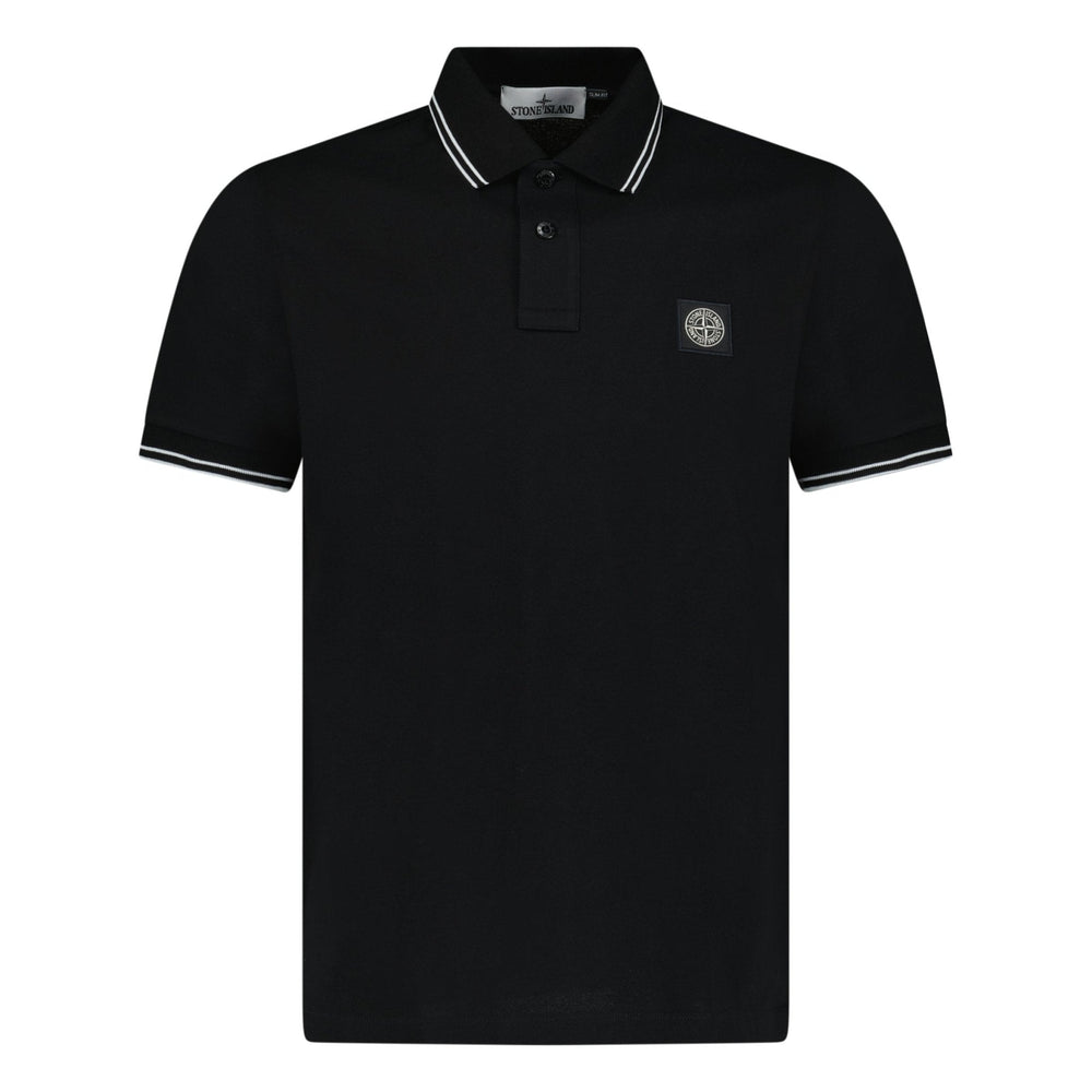 Enhance your casual wardrobe with the Slim Fit Stone Island Patch Logo Stripe Collar Polo T-Shirt in Black. Crafted from premium cotton, this polo boasts a classic silhouette with a modern twist. Featuring the iconic Stone Island logo patch and striped collar detail, it's a versatile choice for effortless style and comfort