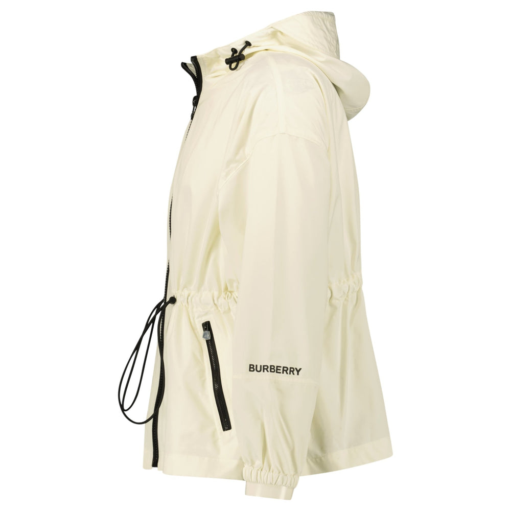 Elevate your outerwear collection with the Burberry 'Birley' Check Hooded Rain Jacket in Vanilla. Expertly crafted from premium polyamide, this versatile jacket is designed to keep you protected from the elements without compromising on style. Featuring Burberry's iconic check detail subtly showcased under the sleeves, this rain jacket exudes sophistication and functionality.