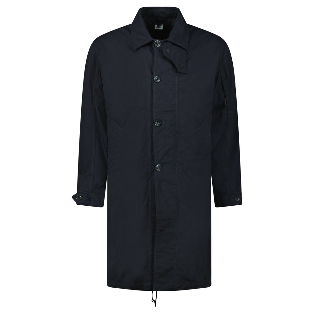 Designed for practical cold-weather layering, it features a classic collar with button placket, full button fastening enhanced with a snap hem, and secure side pockets. The wadding padding provides lightweight insulation, while the signature fishtail hem adds movement and character to the silhouette. A refined, functional outerwear piece rooted in C.P. Company's engineered design language.