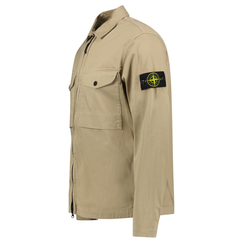 Elevate your wardrobe with the Stone Island Organic Stretch Cotton Satin Overshirt in Beige. Crafted from garment-dyed organic stretch cotton satin, this overshirt offers a blend of durability and comfort. The classic collar and two-way zip closure provide a timeless look, while the chest flap pockets with snap buttons add functional detail. Adjustable snap button cuffs ensure a personalized fit, and the iconic Stone Island badge on the left sleeve signifies quality and style.