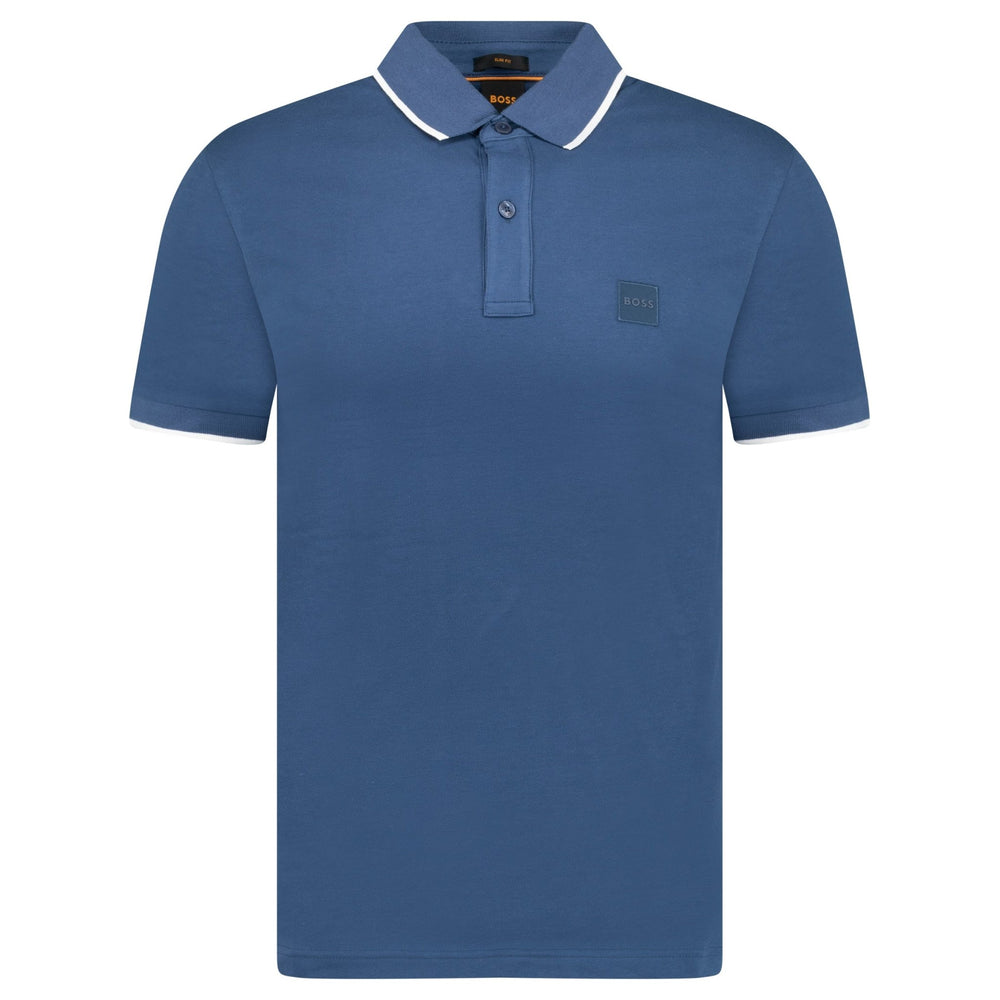 Upgrade your smart-casual wardrobe with the BOSS Passertip Polo T-Shirt in Dark Blue. Designed for a sleek, modern look, this slim-fit polo is crafted from a soft cotton blend with a touch of elastane for flexibility and comfort. The ribbed polo collar and short sleeve cuffs feature refined white tipping, adding a sophisticated contrast. A two-button placket allows for an adjustable fit, while the signature BOSS woven and rubberised logo patch on the chest provides an understated yet premium finish. Ideal for effortless everyday styling or layering under a jacket for a polished look.