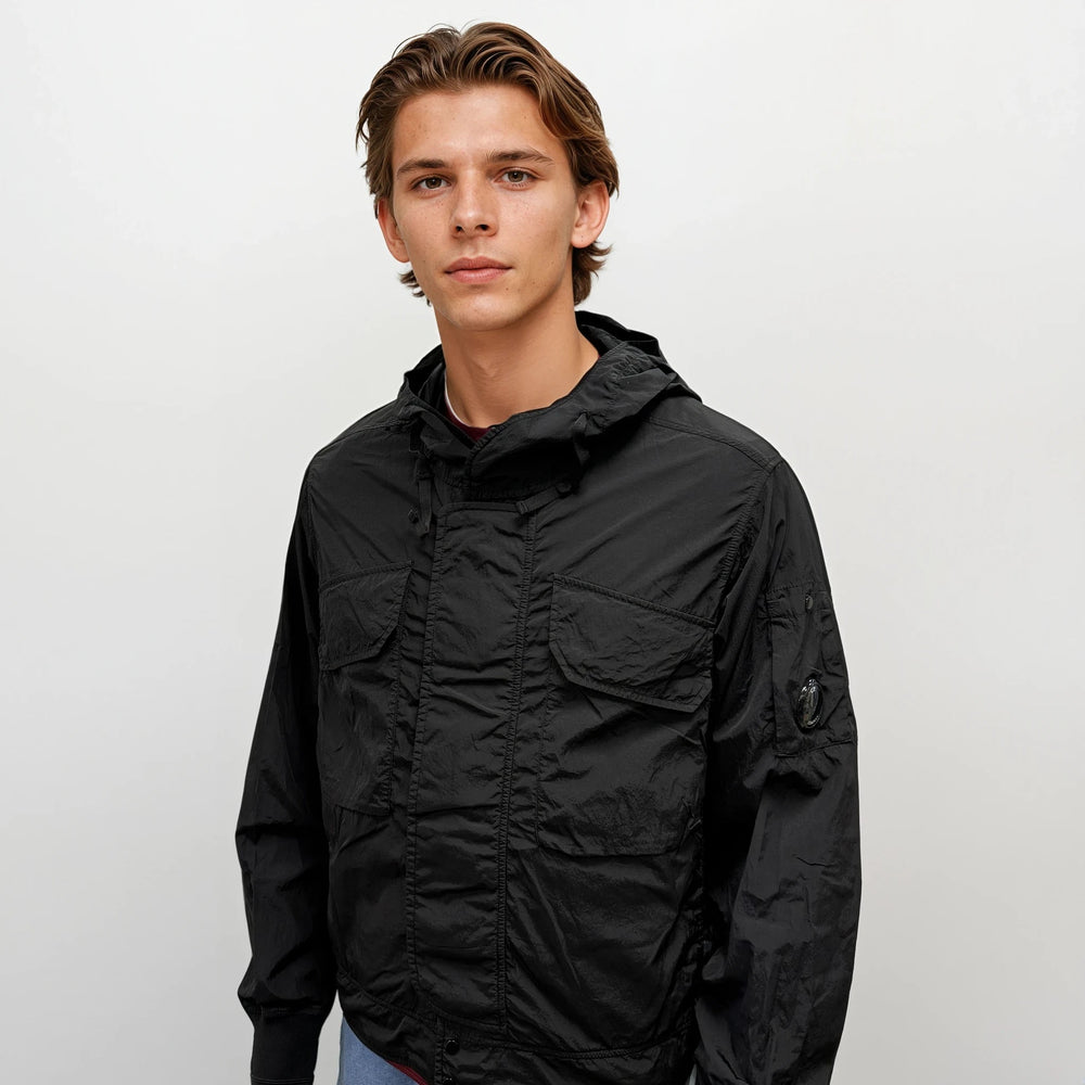 Elevate your outerwear with the C.P. Company Chrome‑R Hooded Lens Jacket in striking black. Crafted from Chrome‑R, a 100% recycled, shiny multifilament nylon made from production scraps, this garment is GRS-certified and dyed with an anti-drop finish for rich, water-resistant depth. It seamlessly blends sustainability with C.P. Company’s signature technical design for a bold, functional aesthetic.