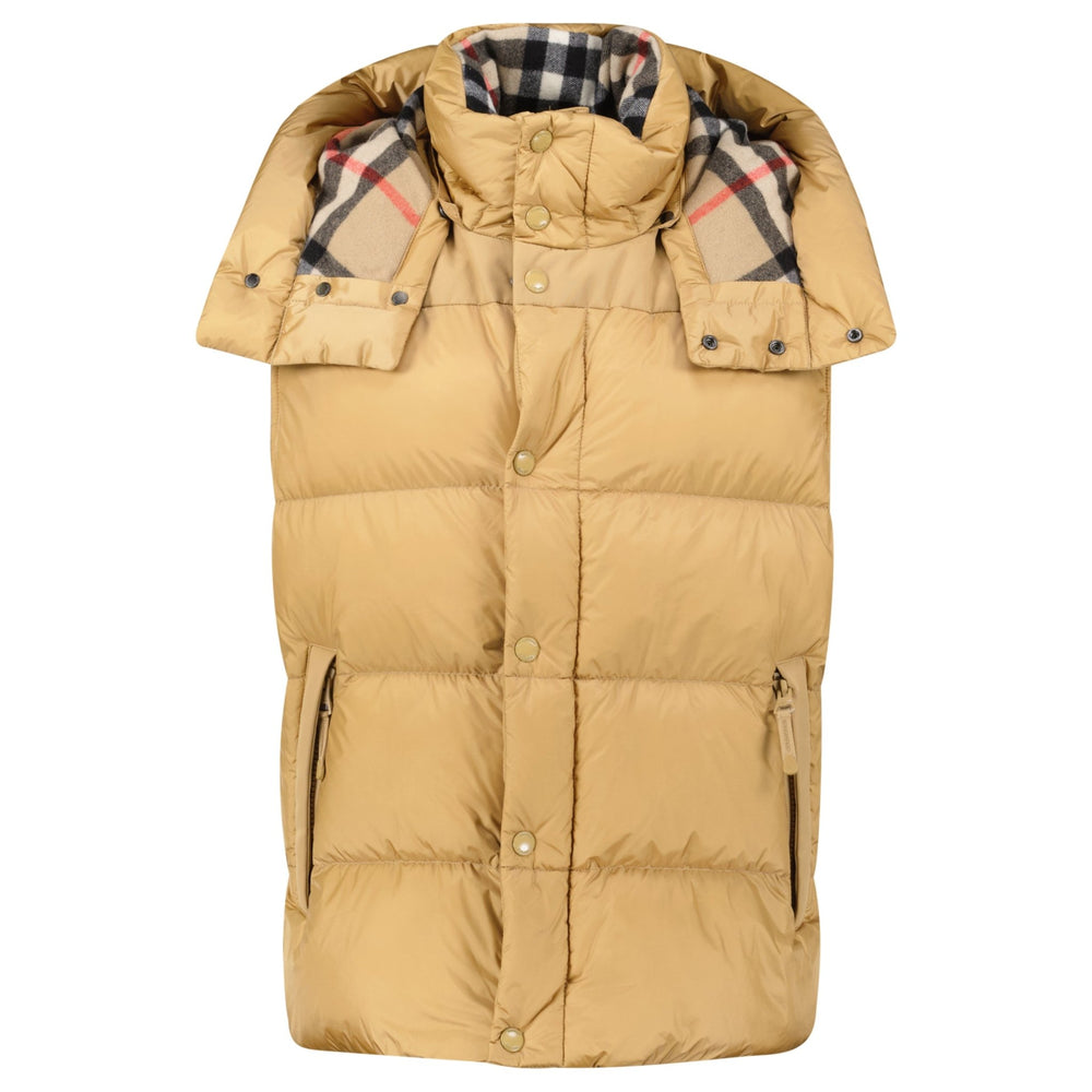 Stay warm and stylish with the Burberry 'Leeds' Detachable Sleeve Hooded Down Jacket in Warm Honey. This versatile jacket features a detachable sleeve design, allowing you to switch between a jacket and a vest depending on your needs. The hood and the down filling provide extra warmth and protection from the cold, while the Warm honey colour and the classic Burberry check lining add a touch of elegance to your winter wardrobe. Perfect for outdoor activities or casual outings, this jacket combines fashion and functionality in one piece.