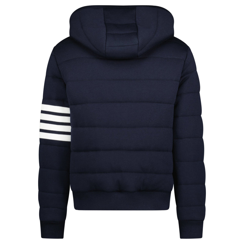 Shop the Thom Browne Merino Wool Jersey Stitch Padded 4-Bar Zip-Up Hoodie in Navy at Boinclo. Crafted from 100% virgin wool, this premium hoodie blends luxury with comfort. Featuring the iconic 4-Bar detailing and a convenient zip-up closure, it’s perfect for elevating your casual wardrobe. The drawstring hood and side slip pockets add practicality to this refined leisurewear piece. Made in Italy, this hoodie embodies Thom Browne’s signature style and craftsmanship.