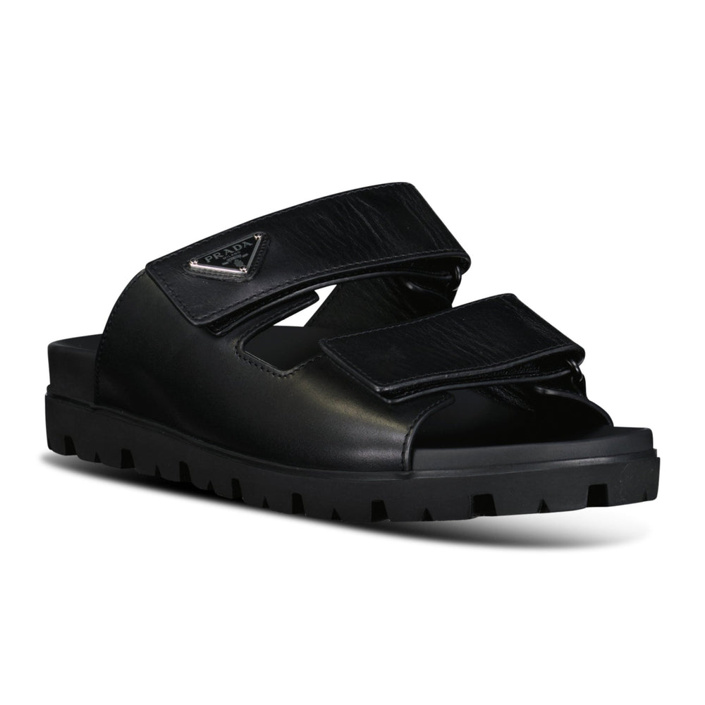 Elevate your summer footwear with the Prada Triangle Logo Leather Strap Sandals in Black. Crafted from premium leather, these sandals combine effortless style with everyday comfort. Featuring two wide straps secured with Velcro closures, they ensure a personalised fit while adding a contemporary edge. The bold lug sole enhances durability and traction, making them as practical as they are stylish. Finished with Prada’s iconic enamelled triangle logo on the strap, these sandals embody understated luxury with a modern twist.