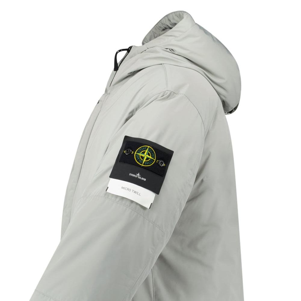 The Stone Island Micro Twill Hooded Down Parka in Pearl Grey combines advanced textile innovation with a clean, modern silhouette. Crafted from a polyester micro twill engineered with a spring-like helical molecular structure, the fabric offers a uniquely soft feel while delivering rich, saturated colour depth.